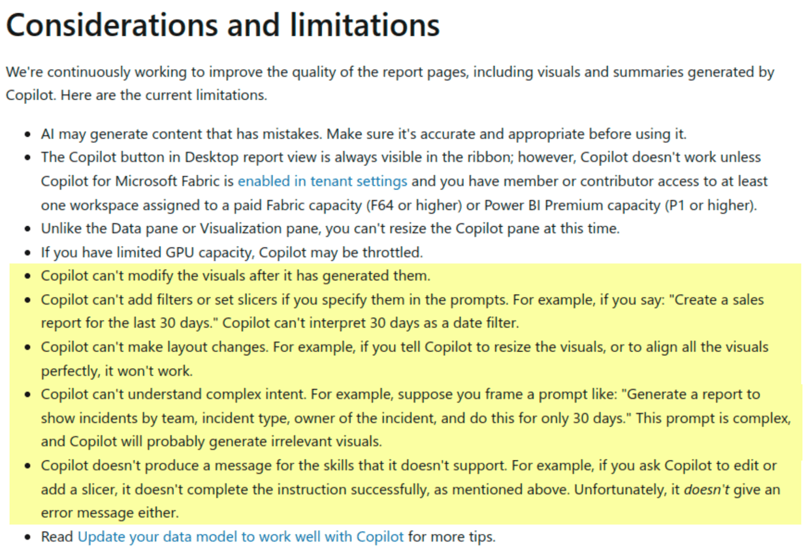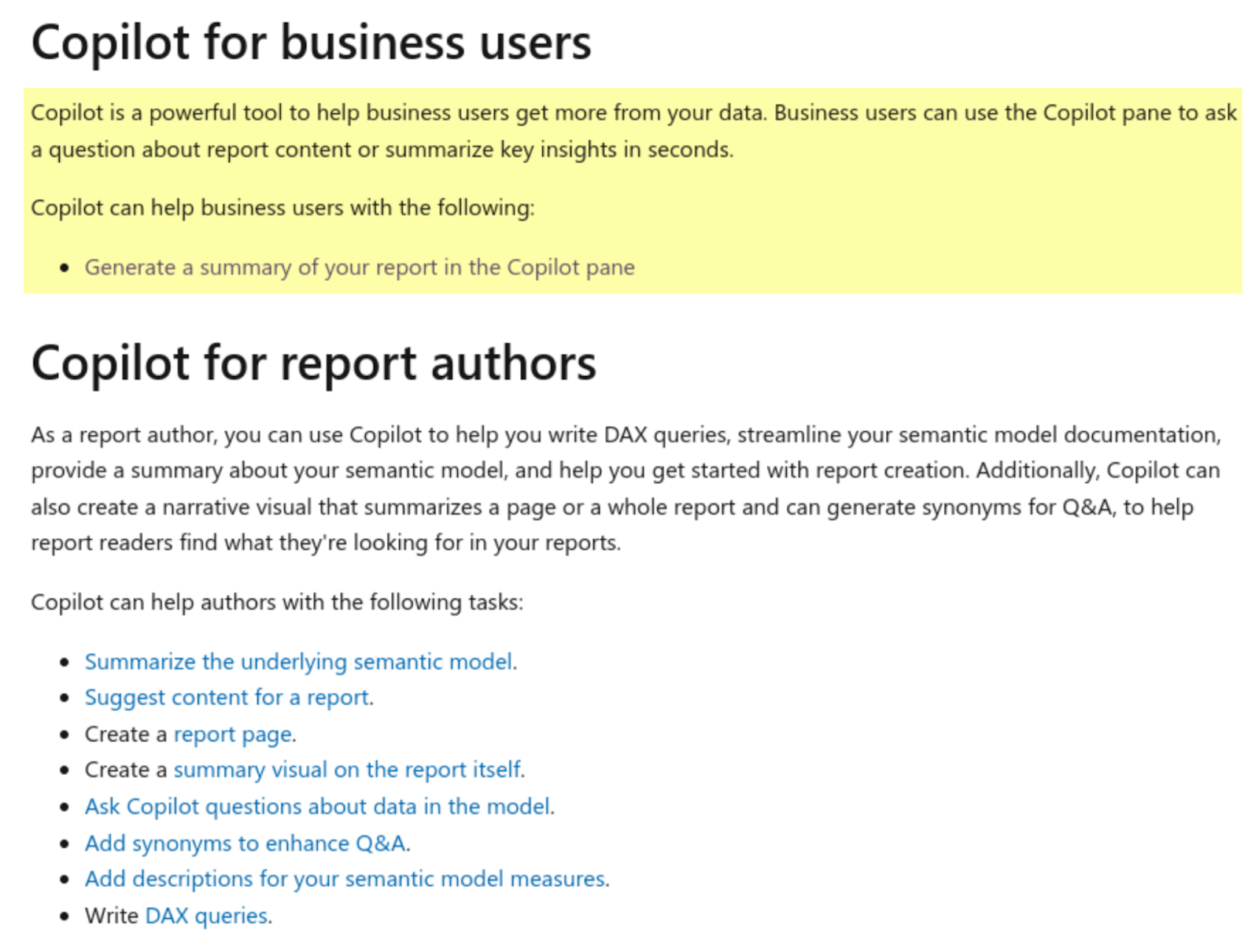 Power BI Copilot is more geared towards report authors. Business users can only use Copilot to generate summaries of existing reports and ask questions about what is already displayed in the report. General data querying and new report creation are only available for report authors, which limits independent access to insights for non-technical users.
